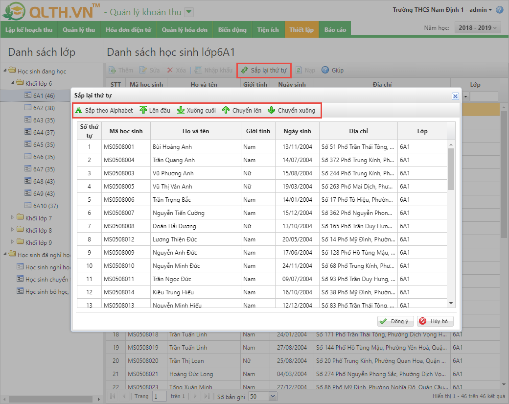 - Từ phiên bản R72, đơn vị chỉ sử dụng phân hệ QLTH – Quản lý khoản thu khi nhập khẩu danh sách học sinh vào phần mềm hoặc khai báo thủ công từng học sinh thì chương trình giữ đúng thứ tự như nhập khẩu excel hoặc thứ tự khai báo, đồng thời bổ sung tính năng sắp xếp lại thứ tự danh sách học sinh để khi có học sinh mới chuyển đến có thể sắp xếp lại danh sách học sinh cho phù hợp.