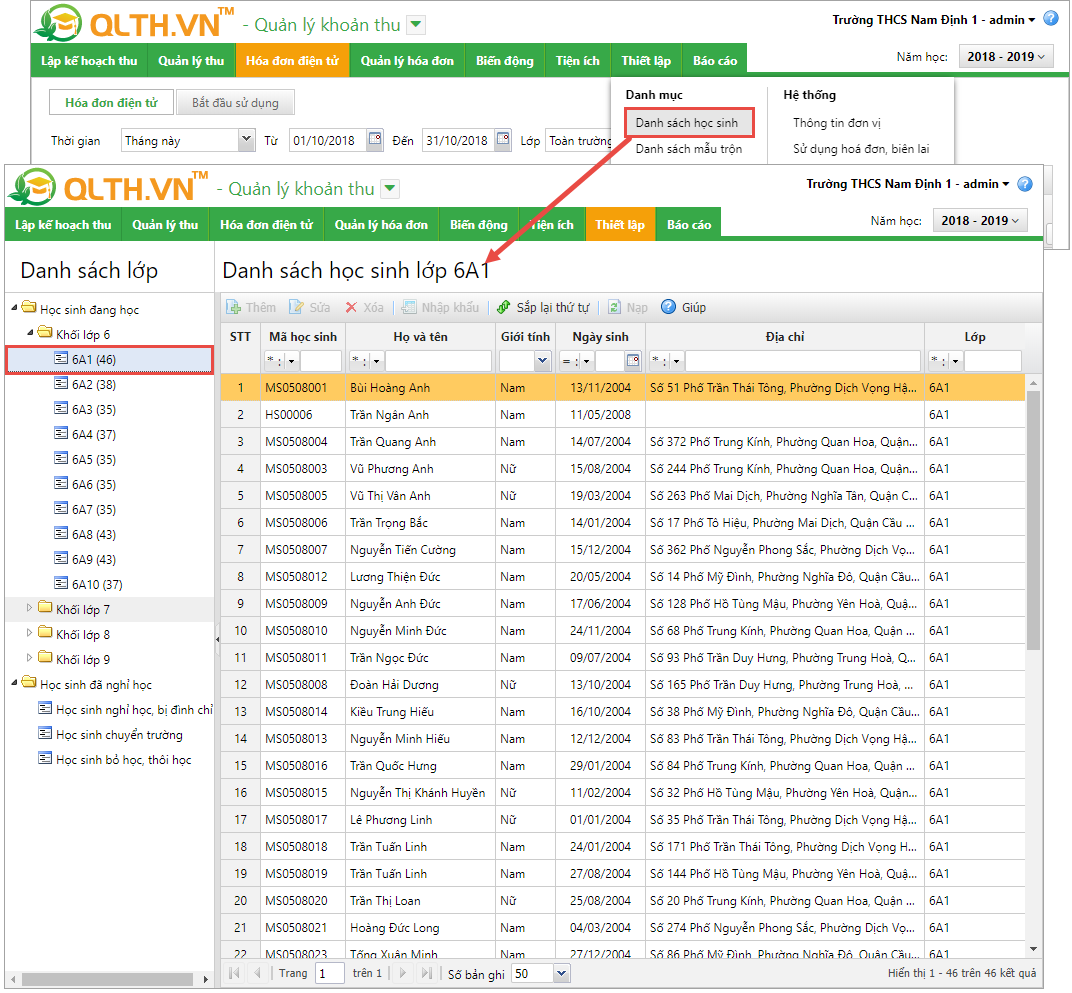 - Vào menu Thiết lập\Danh sách học sinh. Lựa chọn lớp học cần sắp xếp lại thứ tự