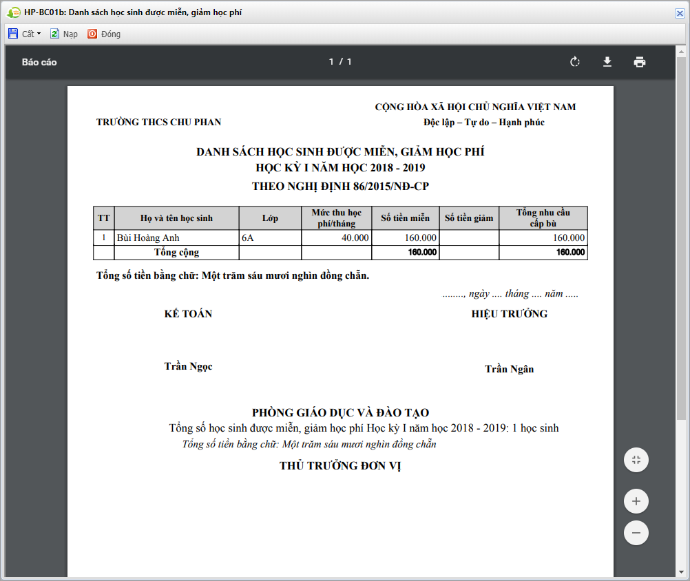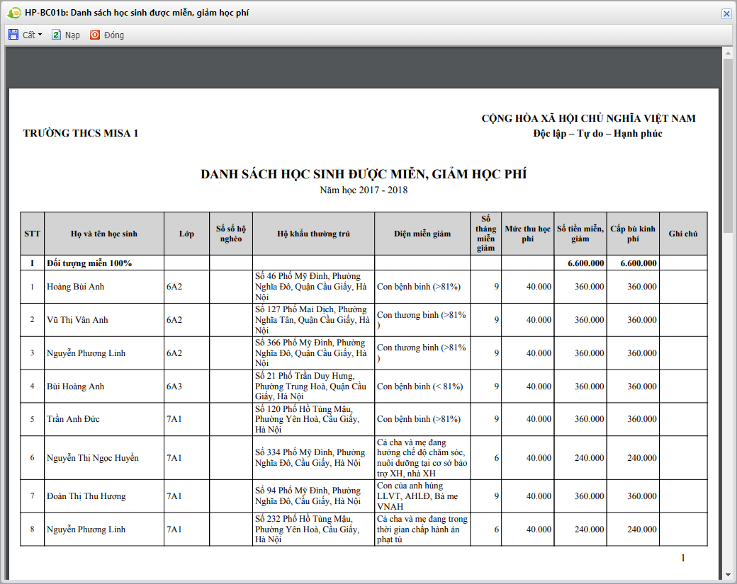 Lưu ý: Trong trường hợp đơn vị PGD Tháp Mười in báo cáo Danh sách học sinh được miễn, giảm học phí (trên form tham số báo cáo không tích chọn tại phần Nhóm theo mức miễn giảm) thì tên báo cáo được thay đổi là Danh sách học sinh được miễn giảm học phí theo nghị định 86/2015/NĐ-CP