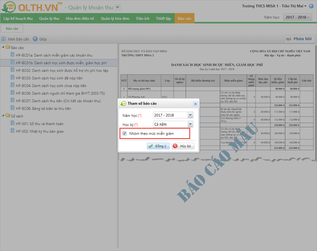 - Vào phân hệ Khoản thu, chọn Báo cáo\HS-BC01b: Danh sách học sinh được miễn, giảm học phí.