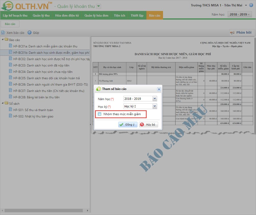 - Để in được báo cáo Danh sách học sinh được miễn, giảm học phí (nhóm theo mức miễn giảm), thực hiện như sau:
