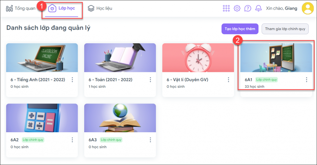 Bước 1: Sau khi đăng nhập, thầy cô nhấn “Lớp học” rồi chọn lớp học có học sinh cần xóa.