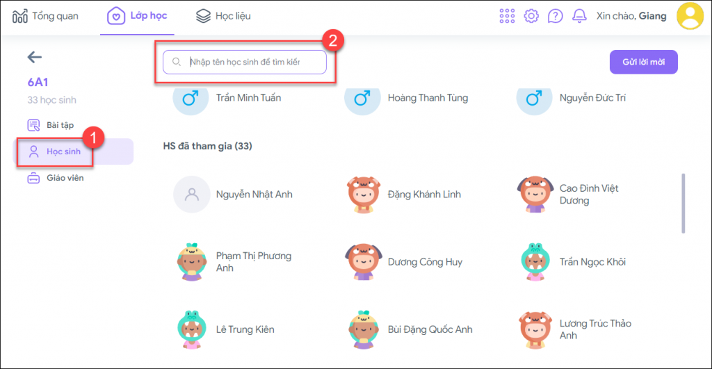 Bước 2: Chọn mục “Học sinh” để xem danh sách học sinh của lớp rồi nhập tên học sinh cần xóa khỏi danh sách trên thanh tìm kiếm để tìm kiếm nhanh chóng.