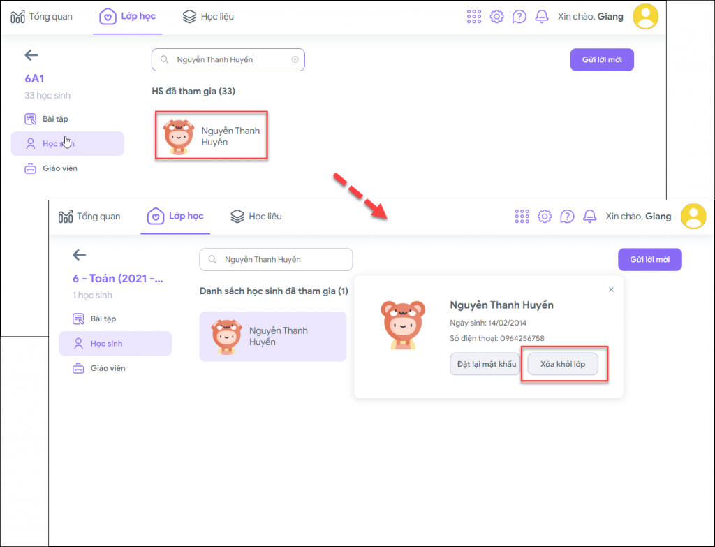 Bước 3: Nhấn chọn vào tên học sinh cần xóa khỏi lớp rồi chọn “Xóa khỏi lớp”.