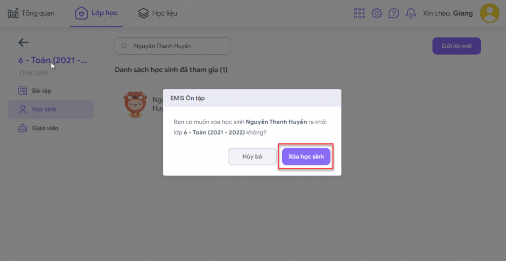 Bước 4: Màn hình hiển thị thông báo xác nhận bạn có muốn xóa học sinh ra khỏi lớp không, chọn “Xóa khỏi lớp” để hoàn thành.