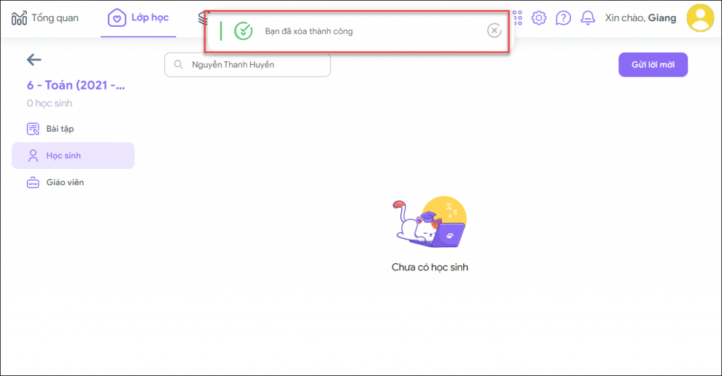 Giao diện hiển thị thông báo “Bạn đã xóa thành công” là học sinh đã được xóa khỏi danh sách lớp học.