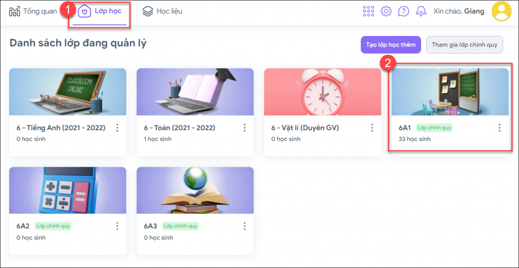 Bước 1: Sau khi đăng nhập, thầy cô nhấn “Lớp học” rồi chọn lớp của học sinh mình cần theo dõi thông tin.