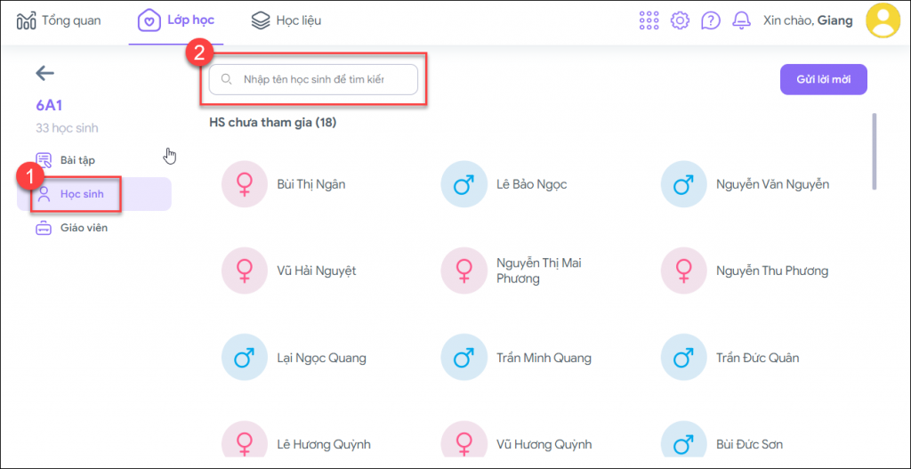 Bước 2: Chọn “Học sinh” để theo dõi danh sách tất cả học sinh của lớp. Nhập tên học sinh cần xem thông tin vào thanh tìm kiếm.