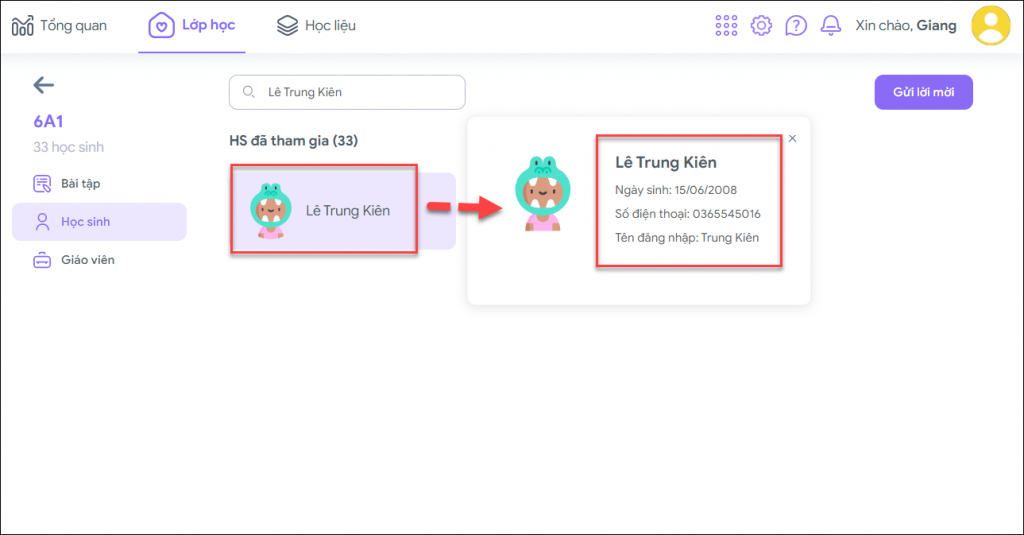 Bước 3: Nhấn chọn tên học sinh cần xem thông tin, thầy cô có thể theo dõi các thông tin như: Tên học sinh; Ngày sinh; Số điện thoại và Tên đăng nhập.