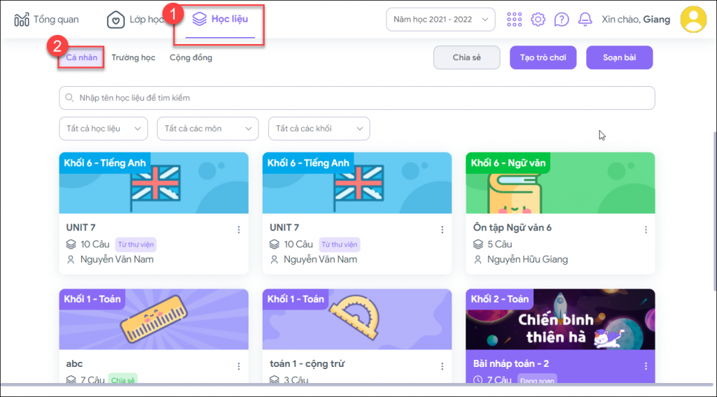 Bước 1: Sau khi đăng nhập, chọn “Học liệu” rồi nhấn “Cá nhân” để tham khảo những tài liệu bạn đang lưu trữ.