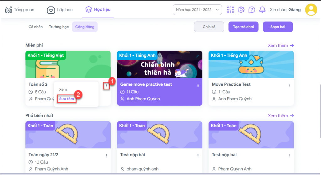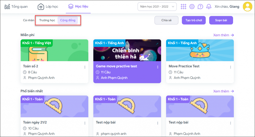 Lưu ý: Thầy cô cũng có thể tham khảo phiếu bài tập có sẵn được các thầy cô khác chia sẻ trong mục “Trường học” hoặc “Cộng đồng”.