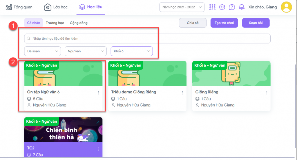 Bước 2: Tìm kiếm phiếu bài tập cần giao bằng cách nhập tên học liệu trên thanh tìm kiếm hoặc sử dụng bộ lọc bằng cách chọn Môn học; Khối lớp và Tình trạng học liệu (Đã soạn; Đang soạn; Lấy từ thư viện,….)
