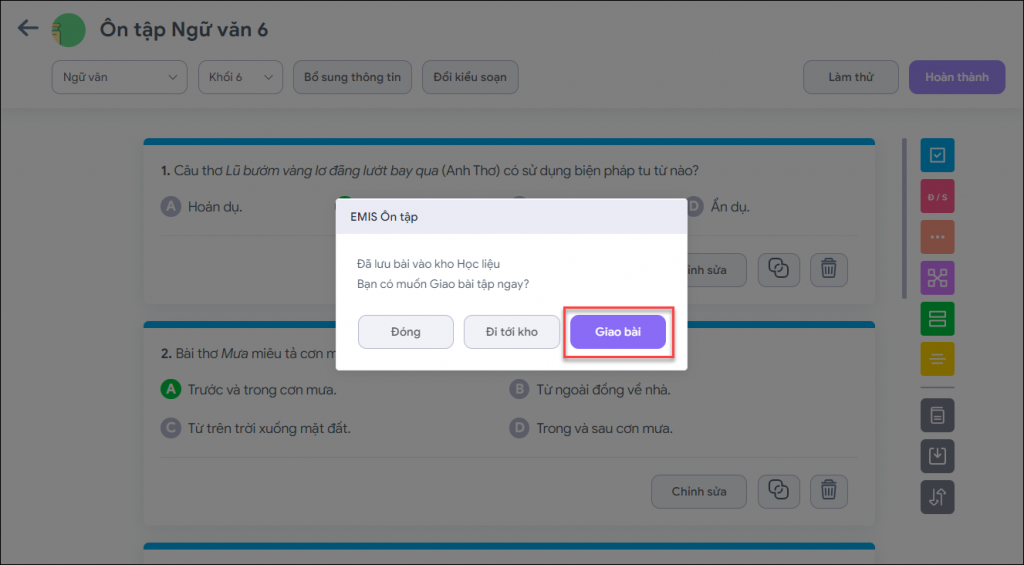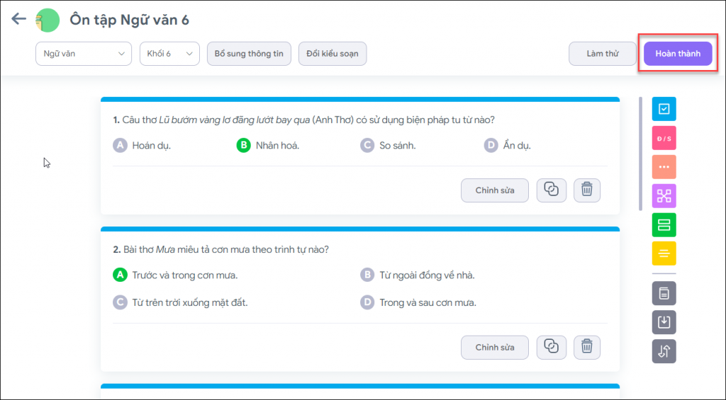 Bước 3: Tại đây, thầy cô có thể xem lại các câu hỏi, chỉnh sửa, thêm câu hỏi mới nếu muốn hoặc sắp xếp thứ tự các câu hỏi. Sau khi đã chỉnh sửa phiếu bài tập xong, chọn “Hoàn thành”.
