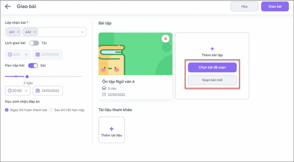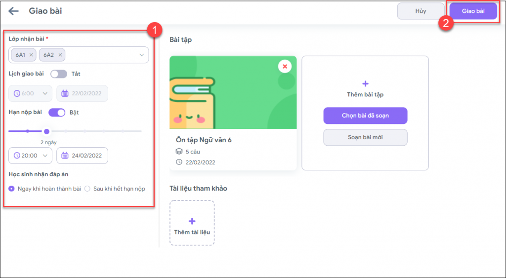 Bước 5: Nhập đầy đủ thông tin về lớp nhận bài, thời gian nhận bài/ nộp bài, thời điểm học sinh có thể xem đáp án. Sau đó, nhấn “Giao bài” để hoàn thành giao phiếu bài tập cho học sinh.