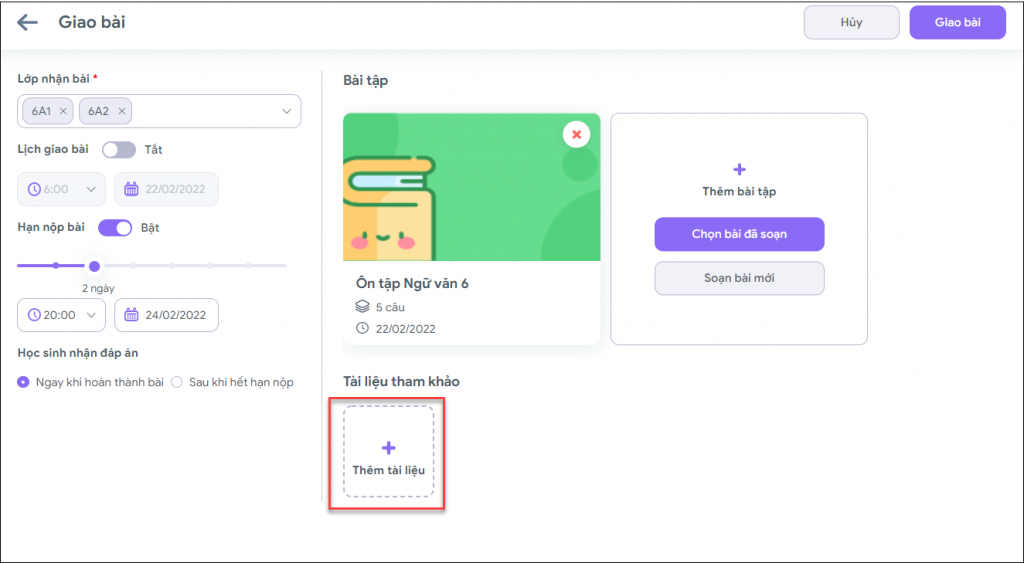 - Giáo viên có thể đính kèm tài liệu để học sinh tham khảo, ôn luyện hỗ trợ cho việc làm bài bằng cách chọn “Thêm tài liệu”.