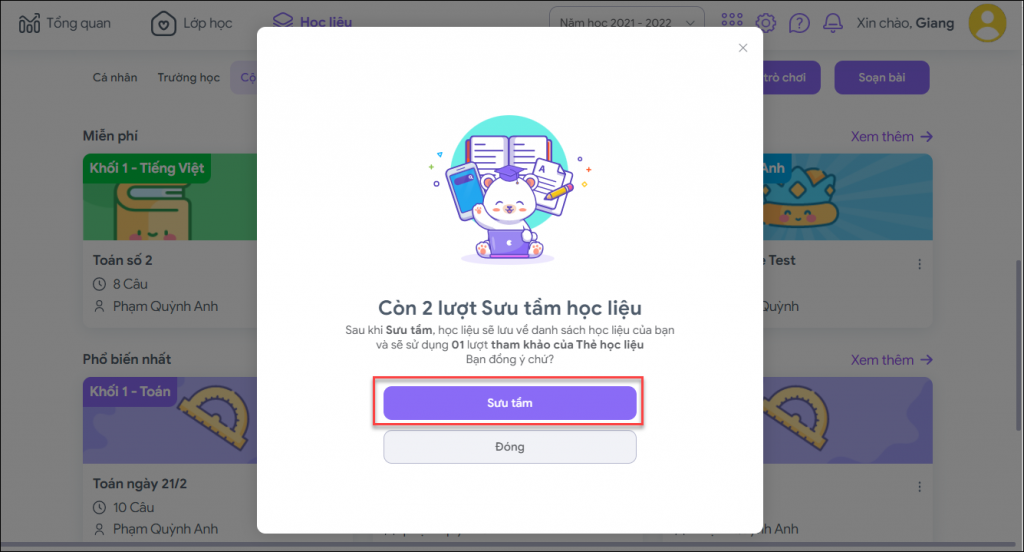 - Tiếp tục xác nhận “Sưu tầm” để hoàn thành lưu phiếu bài tập về kho lưu trữ học liệu cá nhân.