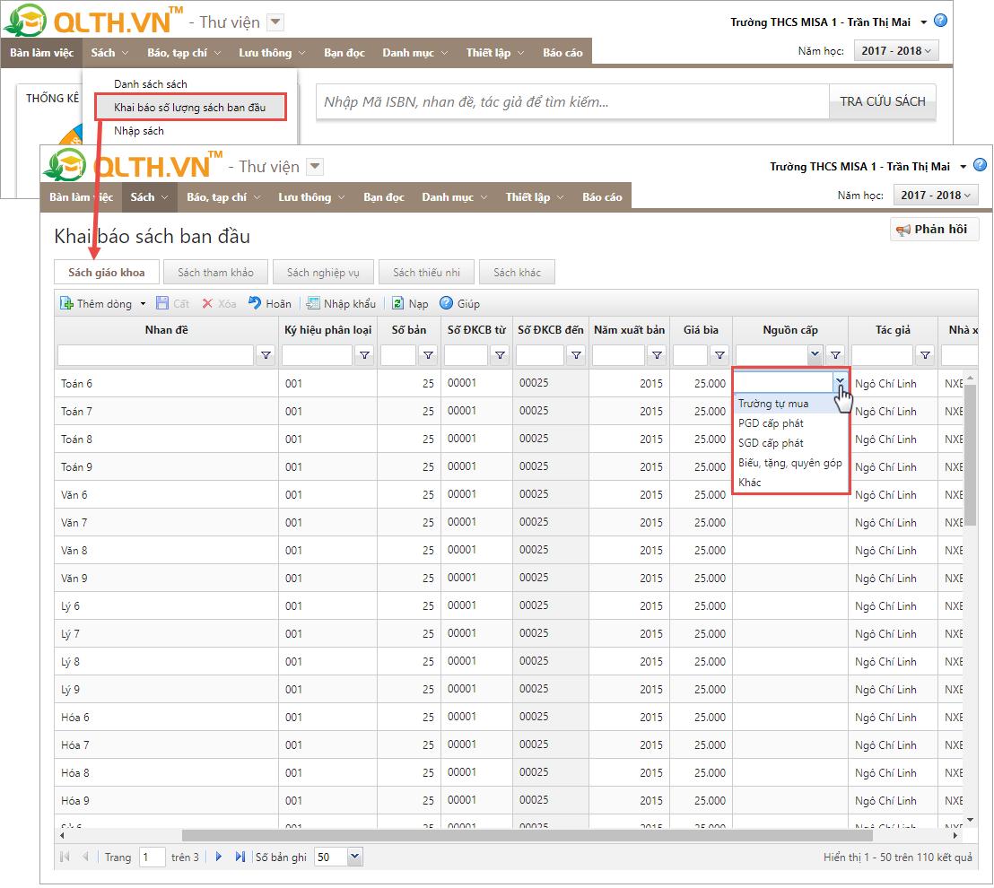 • Tại tab Sách giáo khoa, khai báo thông tin cột Nguồn cấp với các giá trị.