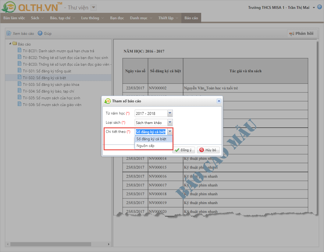 Lưu ý: Để in báo cáo TV – S02 Sổ đăng ký cá biệt như trước kia thì trên form tham số báo cáo anh/chị lựa chọn Chi tiết theoSổ đăng ký cá biệt.
