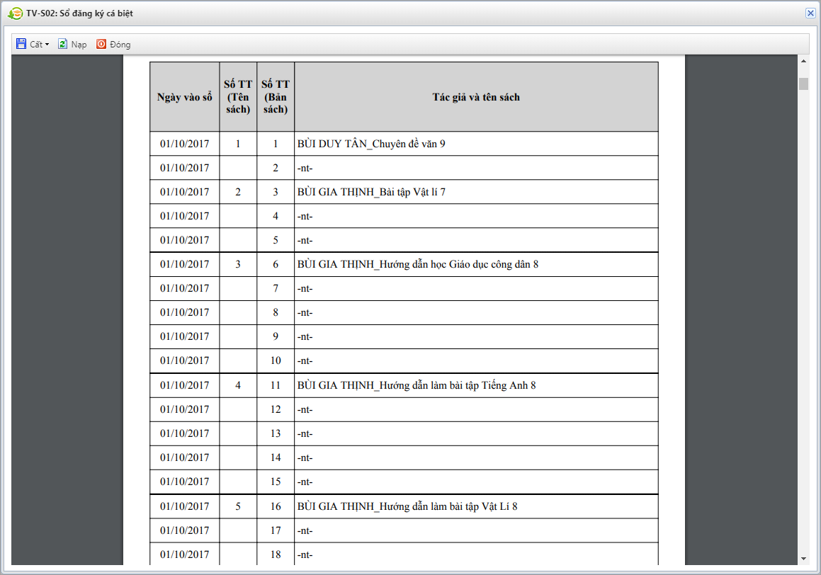 • Vào menu Báo cáo\TV-S02: Sổ đăng ký cá biệt