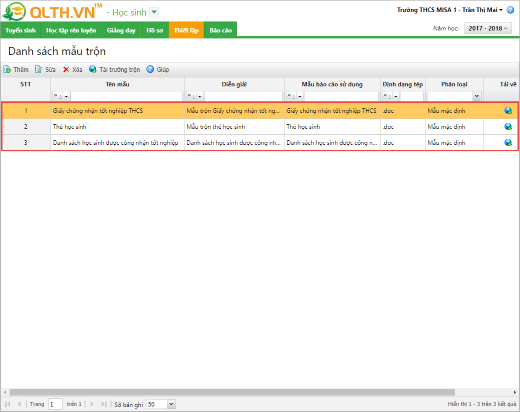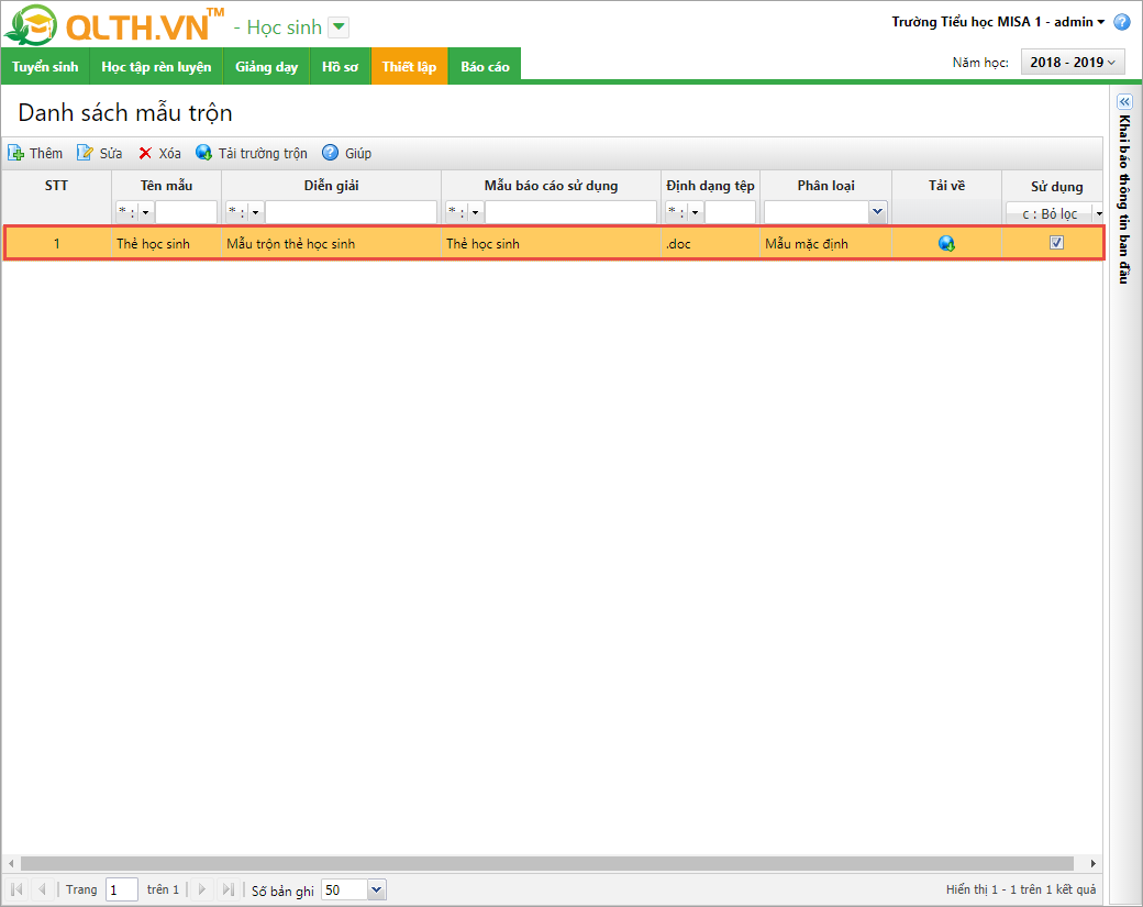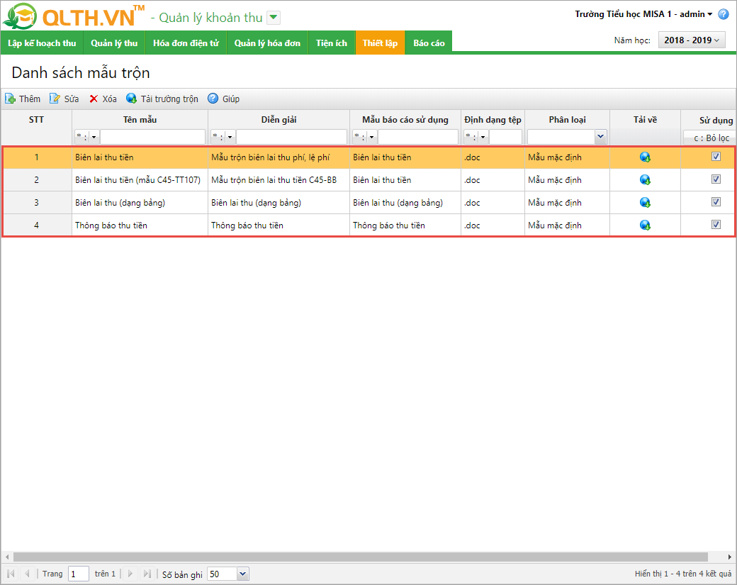 Tách các danh mục mẫu trộn phù hợp với từng phân hệ và từng cấp học, giúp cán bộ giáo viên có thể thiết lập các mẫu. Ví dụ: Mẫu biên lai phù hợp với mỗi đơn vị