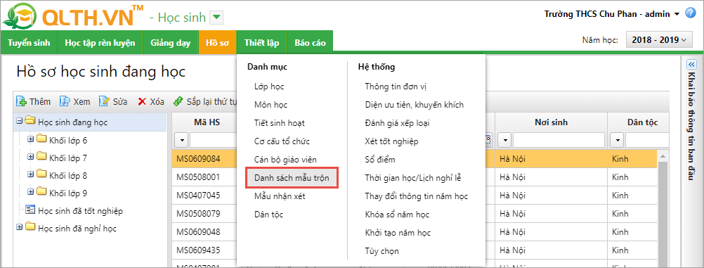1. Vào Thiết lập\Danh sách mẫu trộn