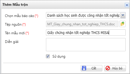 Phần mềm đã mặc định sẵn danh sách 1 số mẫu trộn để giúp cán bộ thư viện có thể lựa chọn mẫu cho phù hợp với từng nghiệp vụ khai báo. Ngoài ra, đơn vị có thể thêm mới mẫu trộn, trộn mẫu, sửa, xóa theo nhu cầu sử dụng của đơn vị.