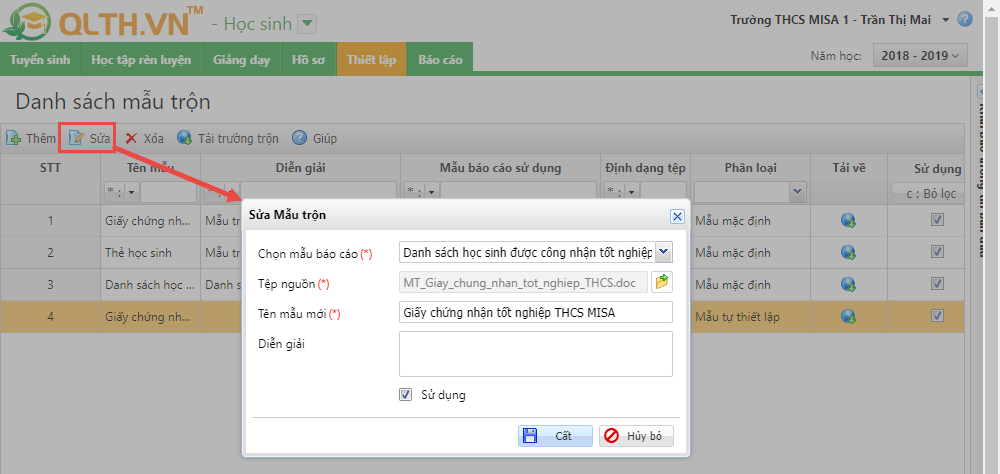 Chức năng này cho phép cán bộ có thể chỉnh sửa các thông tin tại mẫu tự thiết lập.