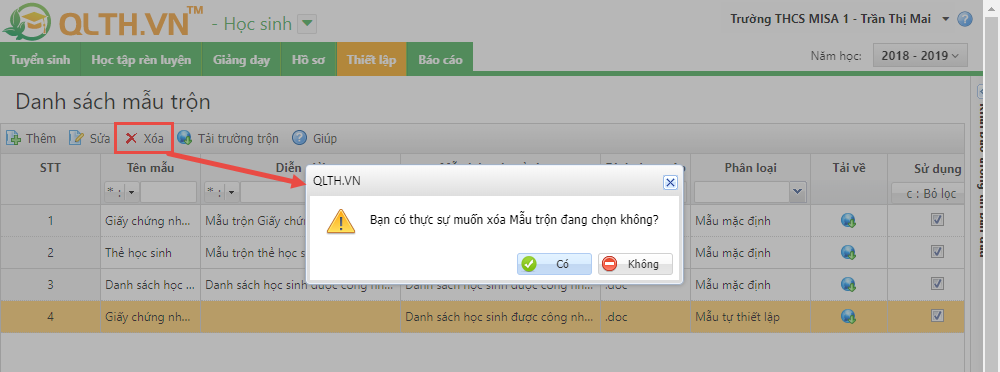 2. Nhấn Xóa để xác nhận xóa mẫu trộn.