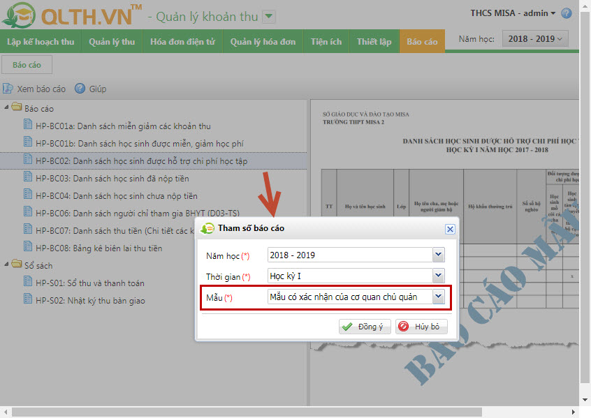 - Tham số Mẫu chọn Mẫu có xác nhận của cơ quan chủ quản.