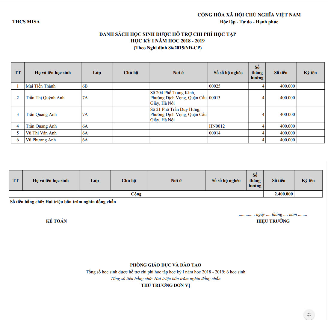 Giúp cho kế toán in được Danh sách học sinh được hỗ trợ chi phí học tập theo đúng mẫu của cơ quan chủ quản (PGD Tháp Mười).