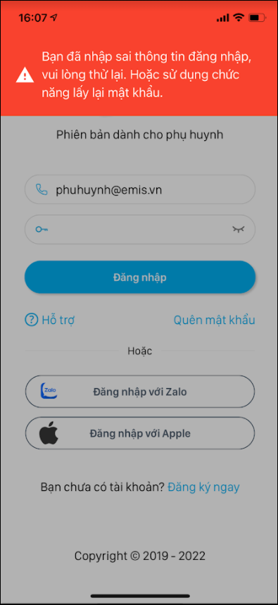 - Anh/chị vui lòng kiểm tra lại Số điện thoại đăng nhập và Mật khẩu đã đúng với số điện thoại đăng ký sử dụng dịch vụ với nhà trường chưa.