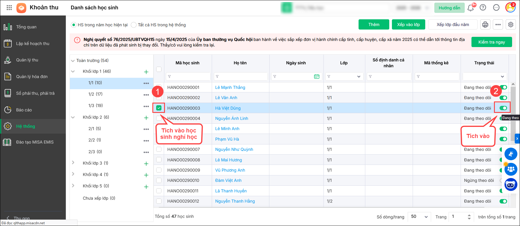 Học sinh đã đóng đủ các khoản, thì bạn ngừng theo dõi học sinh để khi lập đợt thu tiếp theo không hiển thị học sinh đã nghỉ học, chuyển đi theo hướng dẫn tại đây
