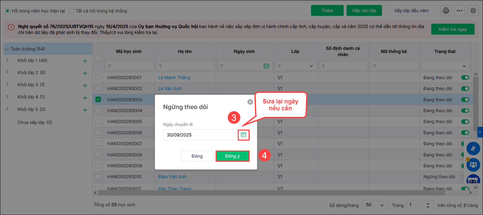 - Sau khi hoàn tất, tiến hành Ngừng theo dõi học sinh theo hướng dẫn tại đây