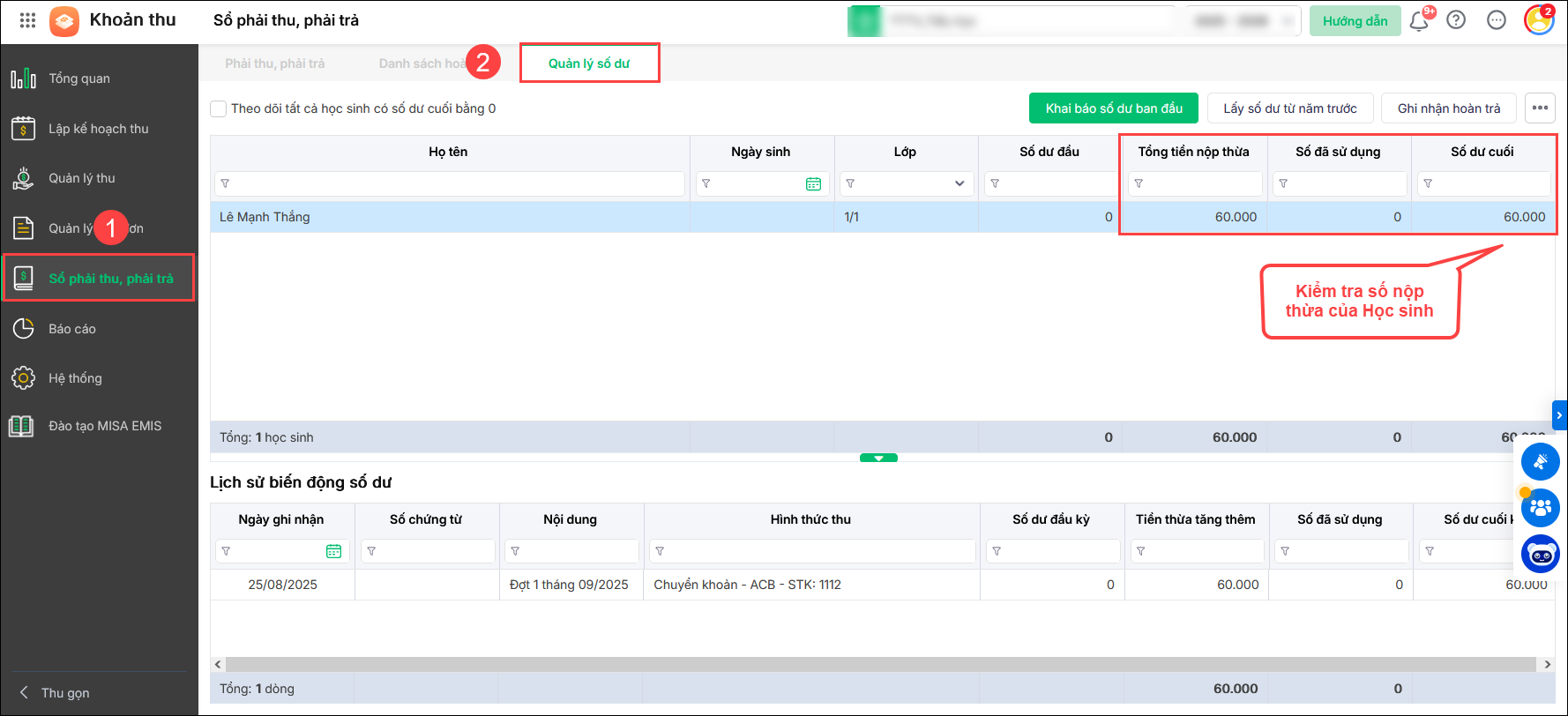 - Vào Sổ phải thu, phải trả \Quản lý số dư để kiểm tra nộp thừa của học sinh