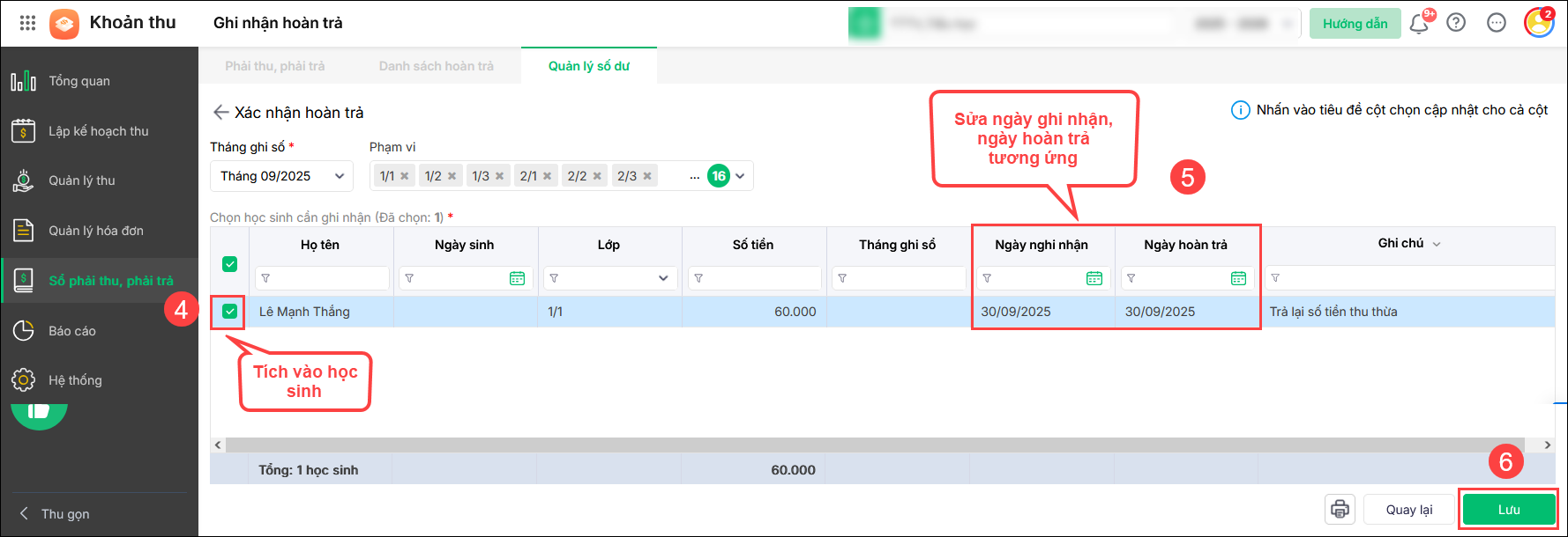 - Tại giao diện Ghi nhận hoàn trả, tích vào học sinh chọn lại thời gian ghi nhận hoàn trả và ngày hoàn trả. Tích Lưu