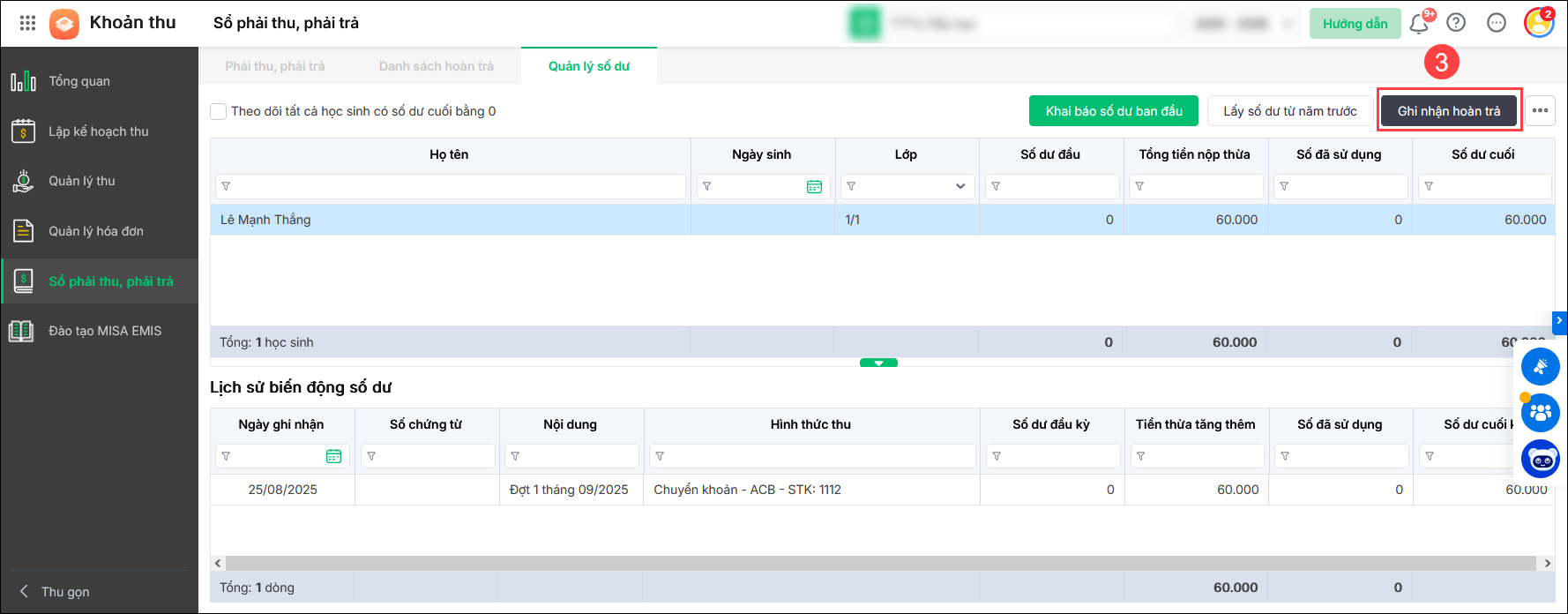 - Tại giao diện Quản lý số dư, tích vào ghi nhận hoàn trả