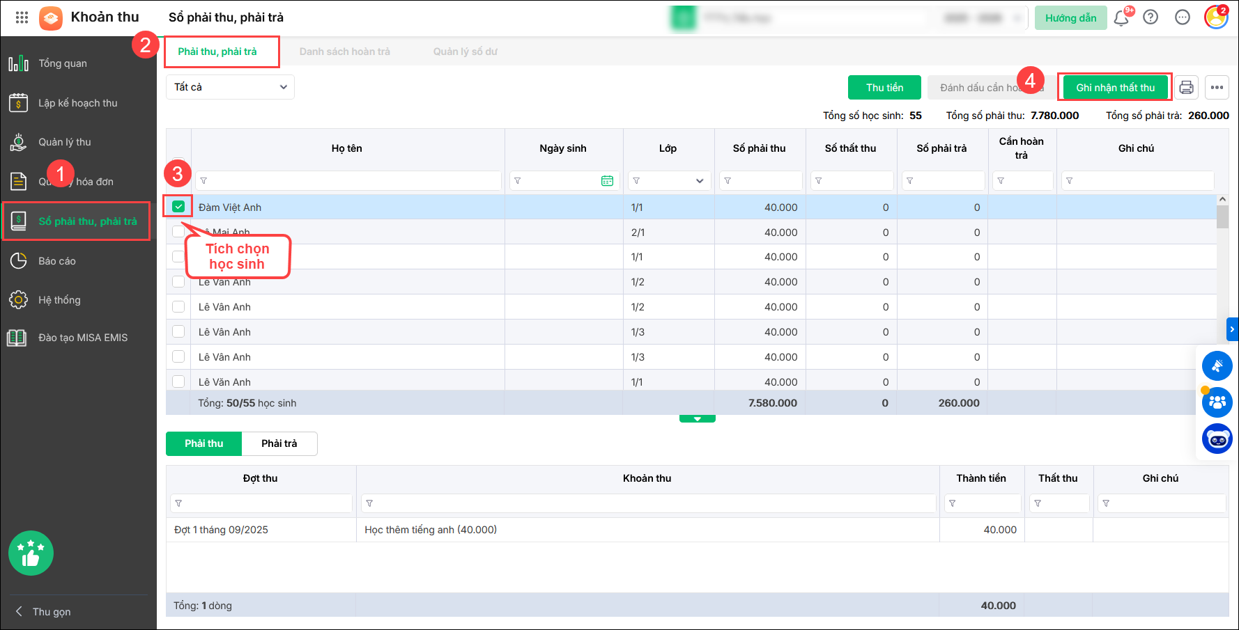 - Tích chọn học sinh cần ghi nhận thất thu, chọn Ghi nhận thất thu.