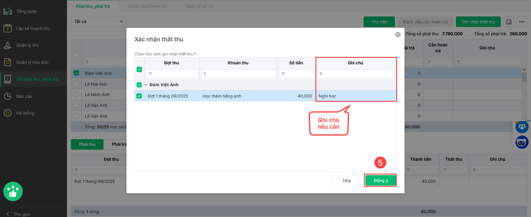 - Xác nhận thất thu: Học sinh, Khoản thu, Số tiền, nhập Ghi chú (nếu có). Chọn Đồng ý.