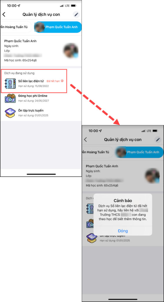 - Màn hình hiển thị dịch vụ Sổ liên lạc điện tử ở trạng thái Đã hết hạn.