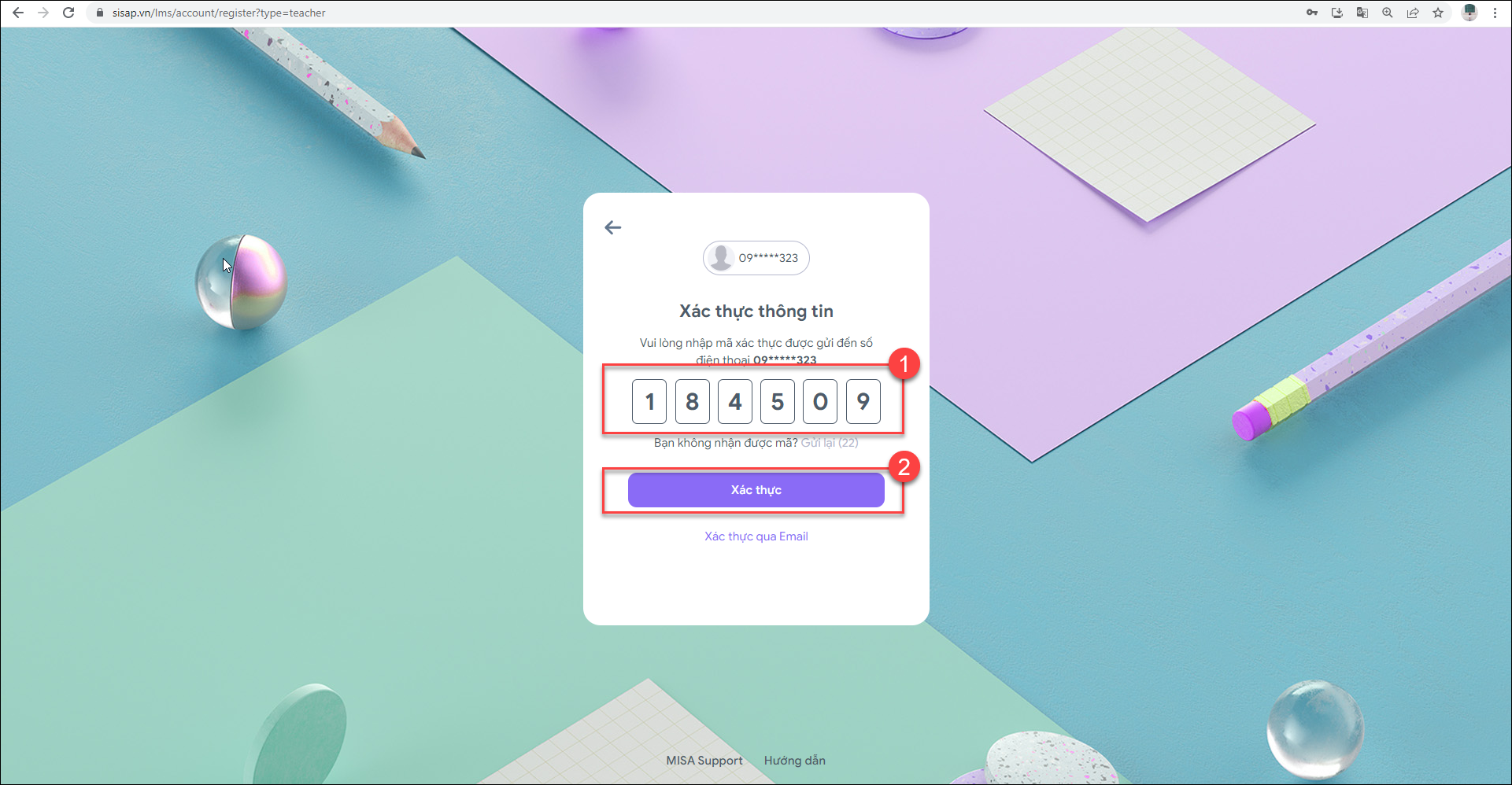 Trường hợp không nhận được mã xác thực qua điện thoại, nhấn Xác thực qua email để nhận mã qua Email bạn vừa đăng ký.