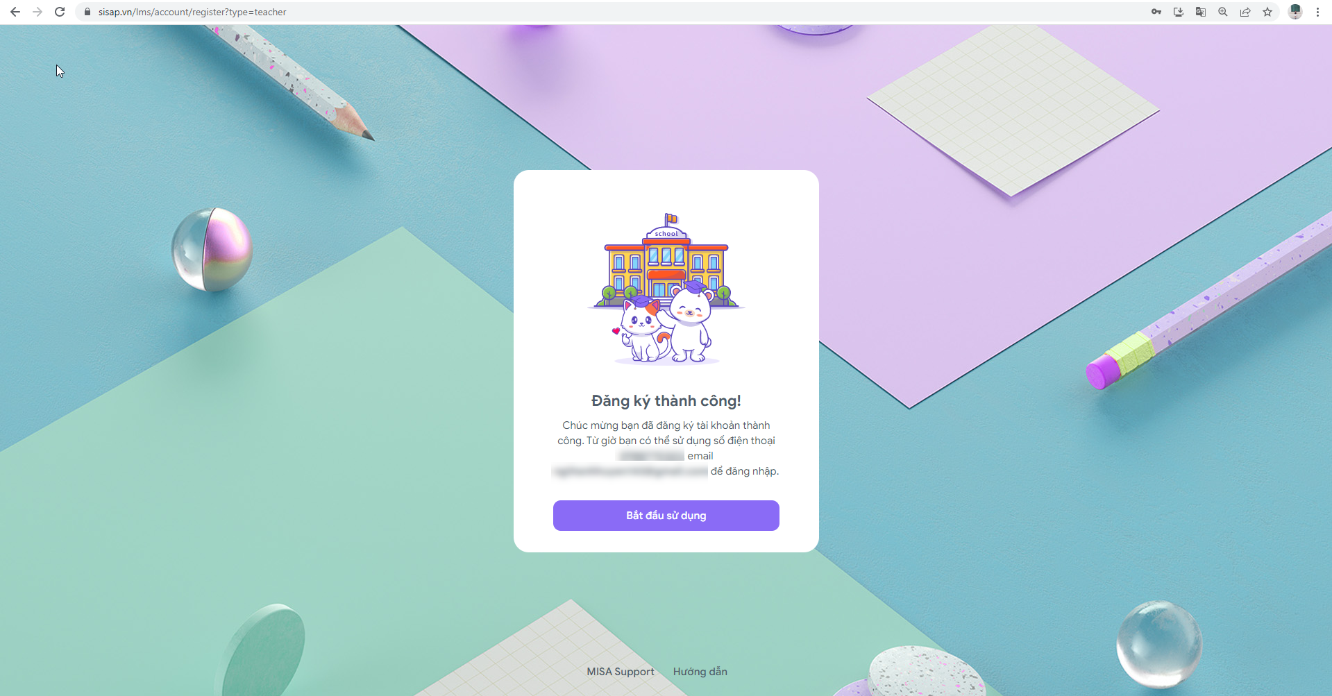 Bước 4: Màn hình hiển thị thông báo đăng ký tài khoản thành công như ảnh. Thầy cô có thể chọn Bắt đầu sử dụng để khám phá ngay EMIS Ôn tập!