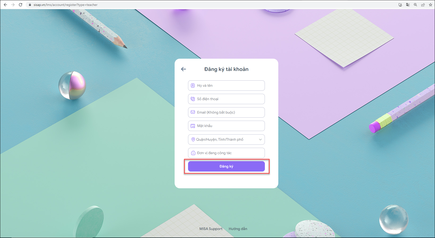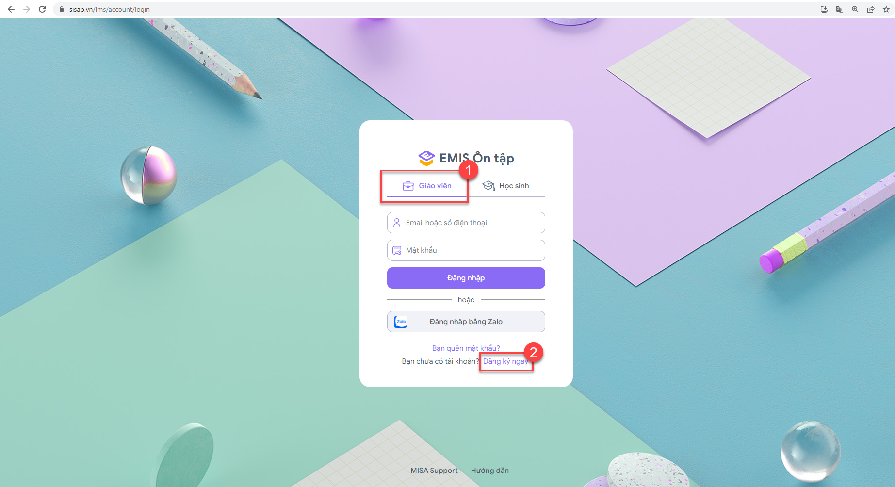Bước 1: Truy cập Website: https://sisap.vn/lms/account/login. Chọn mục Giáo viên, nhấn Đăng ký ngay.