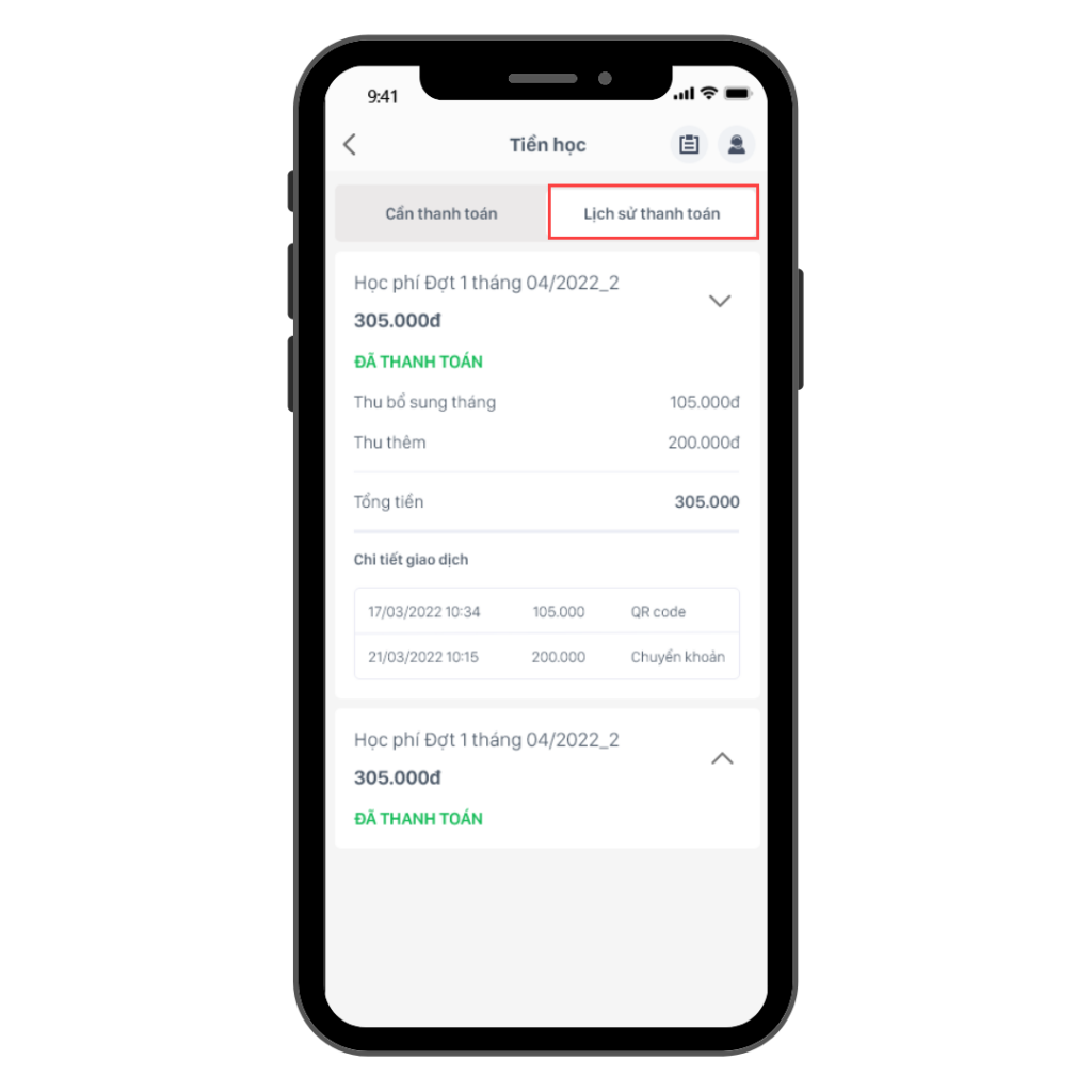 3. Tìm đúng thông báo thu tiền của con mình, sau đó Quét mã QR ở góc bên phải trên phiếu thông báo thu tiền