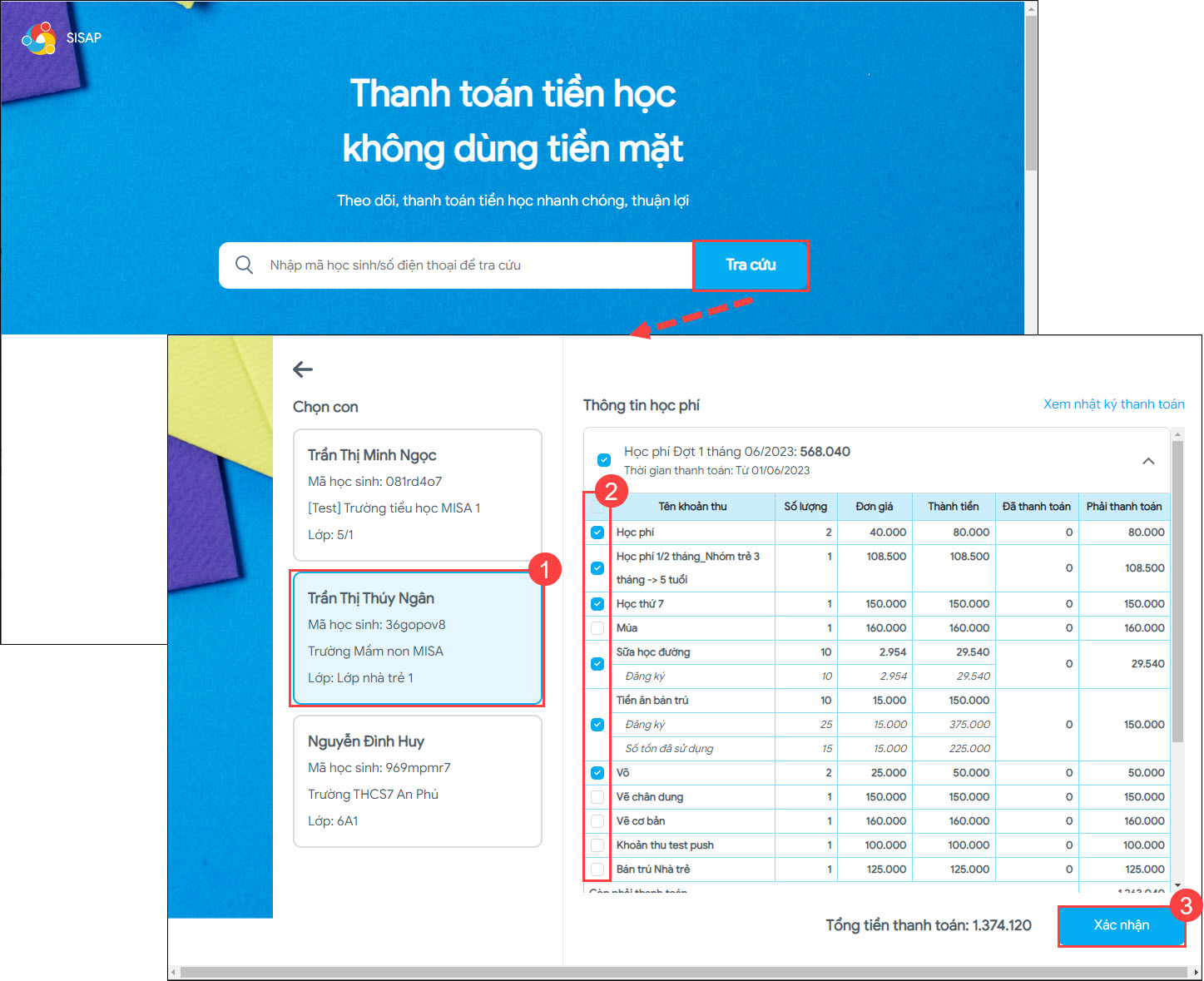Cách 1: Thanh toán tiền học cho con qua ứng dụng SISAP