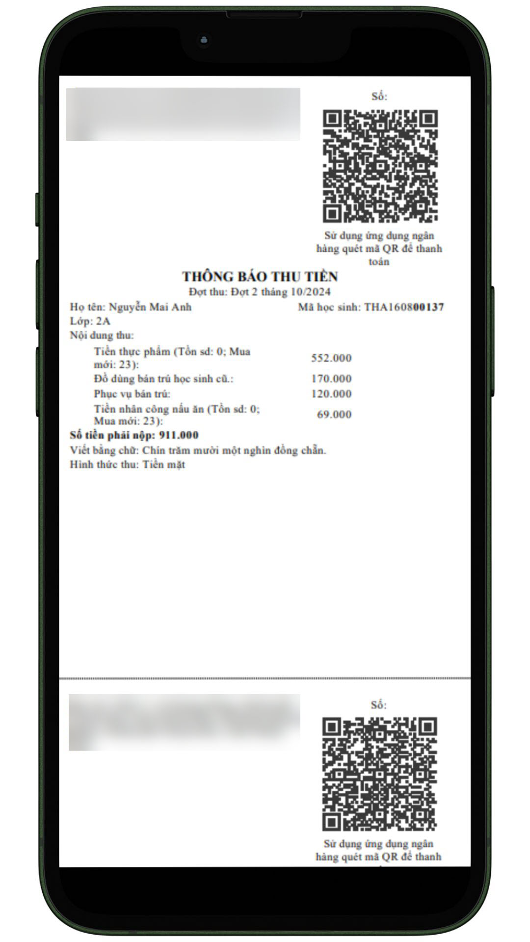 Lưu ý: Nếu phụ huynh chỉ sử dụng 1 điện thoại để thanh toán học phí cho con, anh/chị mở thông báo thu tiền và chụp ảnh thông báo thu tiền của con mình. Sau đó mở tài ngân hàng, quét mã QR