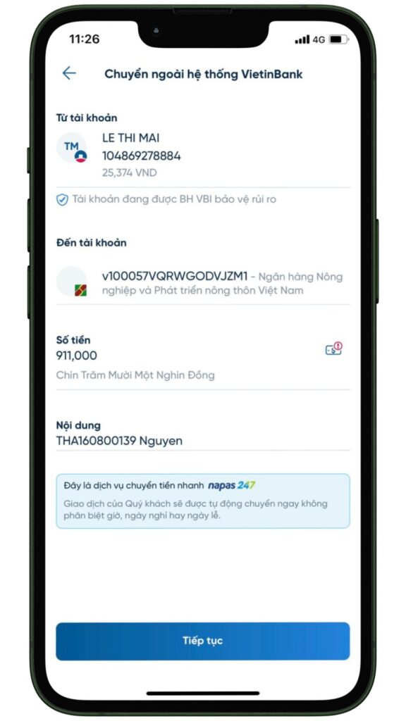 4. Phần mềm sẽ hiển thị đến ngân hàng thụ hưởng và nội dung thanh toán (anh/chị kiểm tra lại nội dung thanh toán là Mã học sinh của con mình xem đúng chưa), chọn Tiếp tục để thanh toán