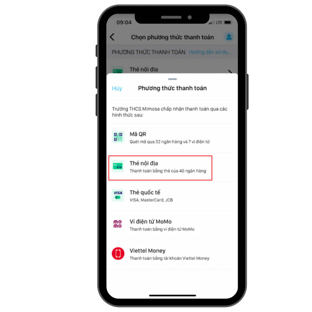Bước 2: Tại mục chọn phương thức thanh toán được Nhà trường chấp nhận, phụ huynh chọn Thẻ nội địa.