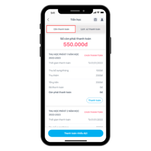 Bước 1:Ứng dụng hiển thị chi tiết các đợt thu của con tại mục Cần thanh toán, những đợt thu đã nộp có trạng thái Đã thanh toán. Với những đợt thu Chưa thanh toán, phụ huynh nhấn Thanh toán để nộp.
