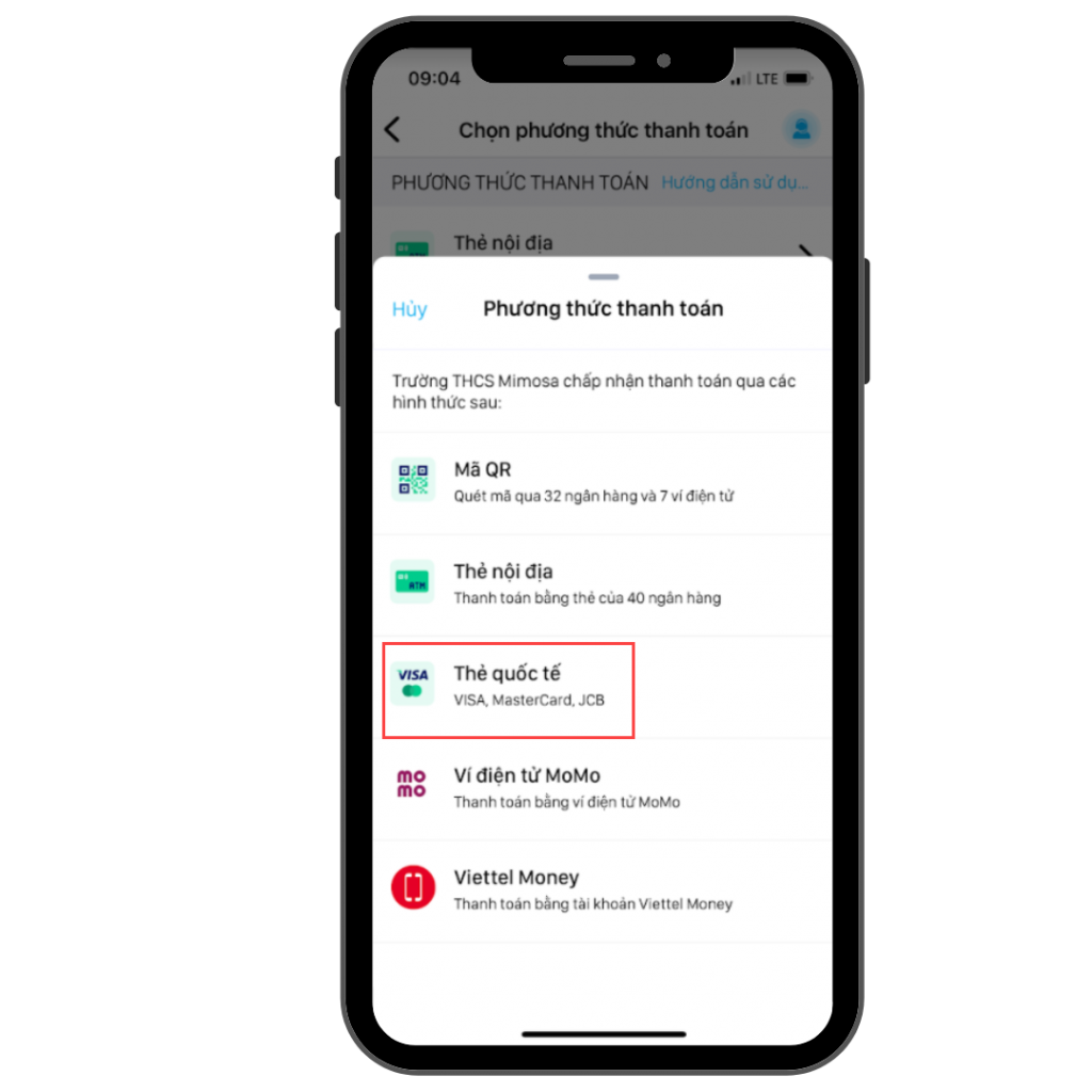 Bước 2: Tại mục chọn phương thức thanh toán được Nhà trường chấp nhận, phụ huynh chọn Thẻ quốc tế.