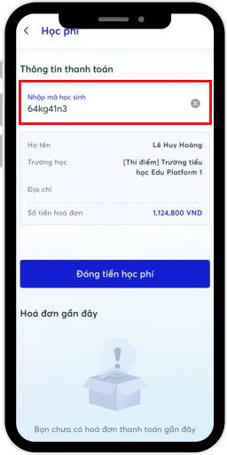 Nhập mã học sinh của con, ứng dụng tự động lấy lên thông tin tiền học của con